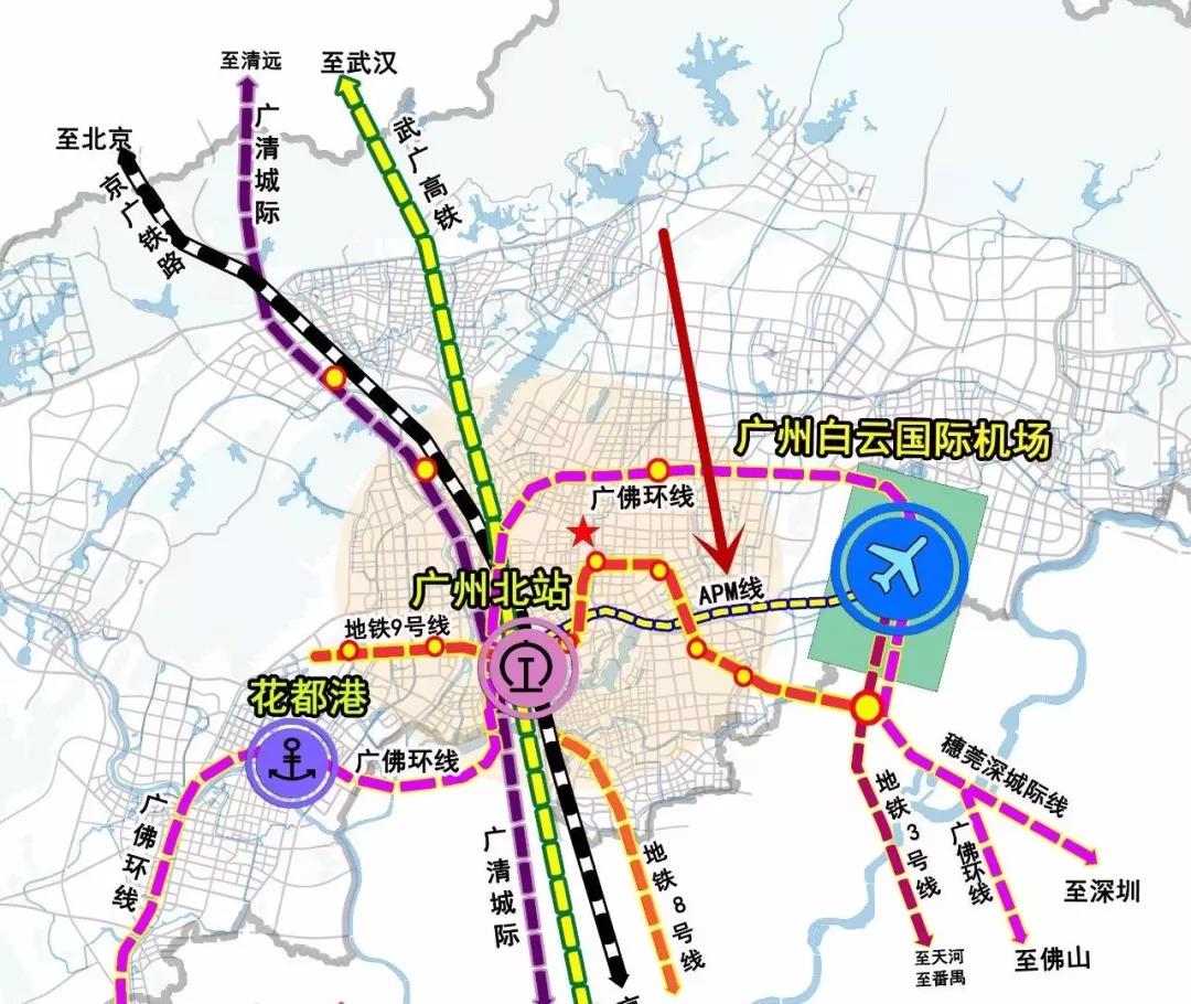 广州北站已引入京广普铁、京广高铁、地铁九号线,将接入在建的广清城际、广佛环城际、穗莞深城际,以及规划建设的地铁八号线、广清城际二期(广州北站至广州站),预留广河、广湛、广永、贵广客专以及东北客车联络线等线路。