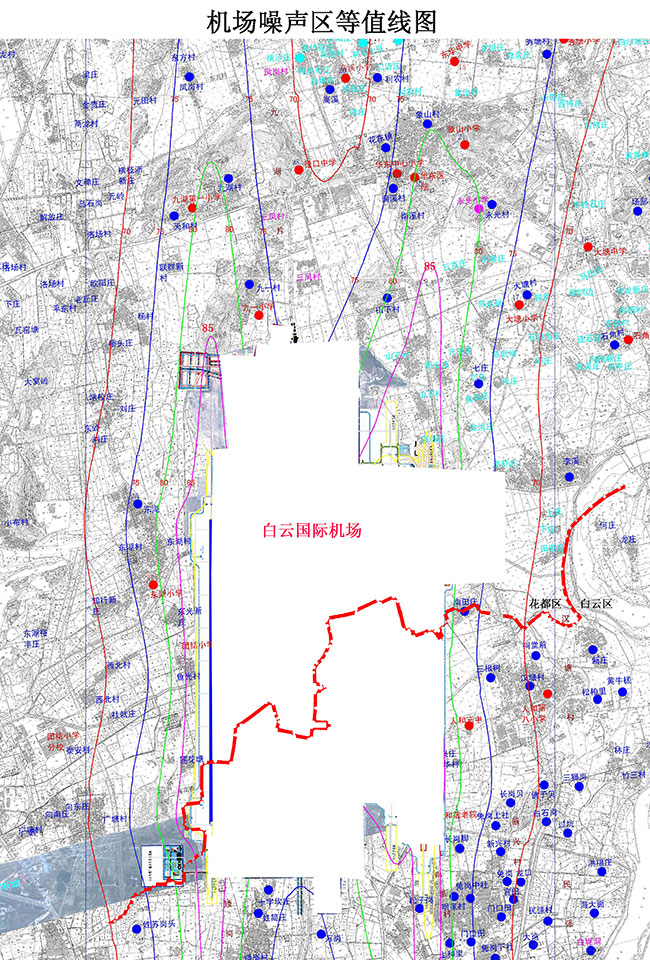 根据原国家环保总局和广东省环保厅对广州白云国际机场扩建工程《环境影响报告书》批复的要求及成人直播平台 人民政府常务会议的决定,广州白云国际机场噪声区治理范围为噪声85分贝等值线区域范围内(附图:机场噪声85分贝等值线图)。其中涉及成人直播平台 花东镇山下村、七庄村,花山镇东湖村,新华街团结村。