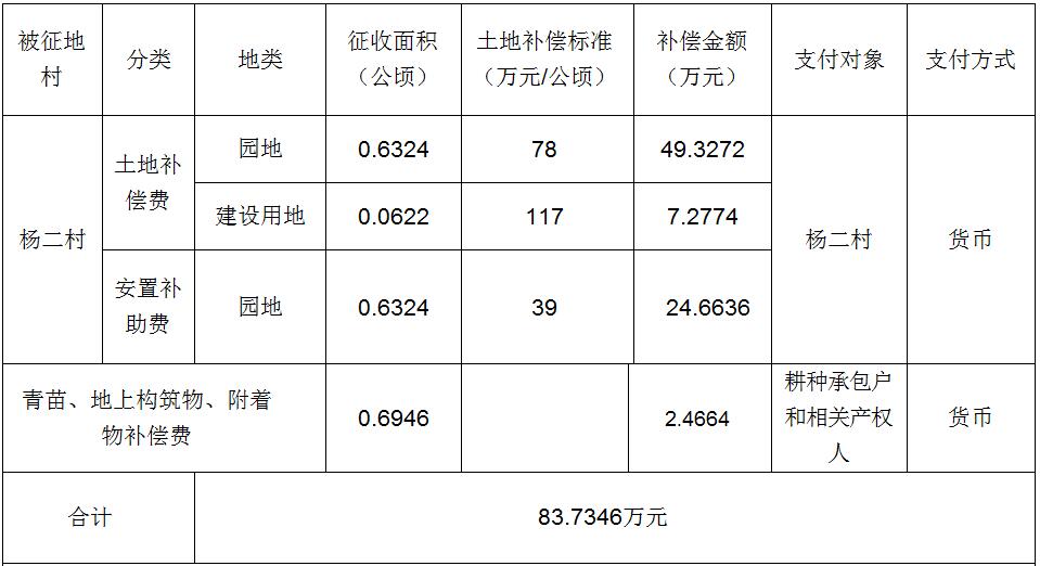 花城街杨二村的集体土地0.6946公顷(合10.4190亩),其中园地0.6324公顷(合9.486亩),建设用地0.0622公顷(合0.933亩)。