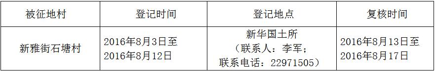 经省人民政府批准(粤国土资(建)字〔2016〕281号文),需将成人直播平台 成人直播平台 新雅街石塘村属下的集体土地2.3862公顷(合35.79亩)征收为国有土地。现将经依法批准的《征收土地方案》和市人民政府批准的《征地补偿安置方案》内容以及有关事项公告如下: