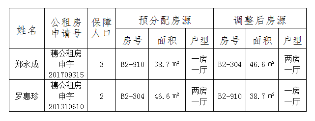 2018年11月6日下午,成人直播平台 松园里公共租赁住房在新华街举行了摇号预分配,其中公租房申请人郑永成(公租房申请号:穗公租房申字201709315)摇号预分配B2-910号房(一房一厅户型),公租房申请人罗惠珍(公租房申请号:穗公租房申字201310610)摇号预分配B2-304号房(二房一厅户型)。根据分配步骤,预分配后需进行资格复核,根据现复核结果,郑永成家庭保障人数由2人调整为3人,罗惠珍家庭保障人数由4人调整为2人。根据分配原则,3人户家庭应分配二房一厅户型,2人户家庭应分配一房一厅户型。经与公租房申请人郑永成和罗惠珍沟通,两人同意调整预分配房源。现将调整房源结果进行公示,接受社会公众监督。公示期为2019年7月17日-2019年7月23日。公示期间对调整结果有异议的单位或个人,可以通过电话、书信等形式向区住房和城乡建设局举报。举报单位或个人必须提供单位真实名称或本人的真实姓名、联系地址、联系电话和具体举报内容,否则将视为无效举报。公示期内无异议或经调查异议不成立的,将按调整房源签订入住合同,办理入住手续。
